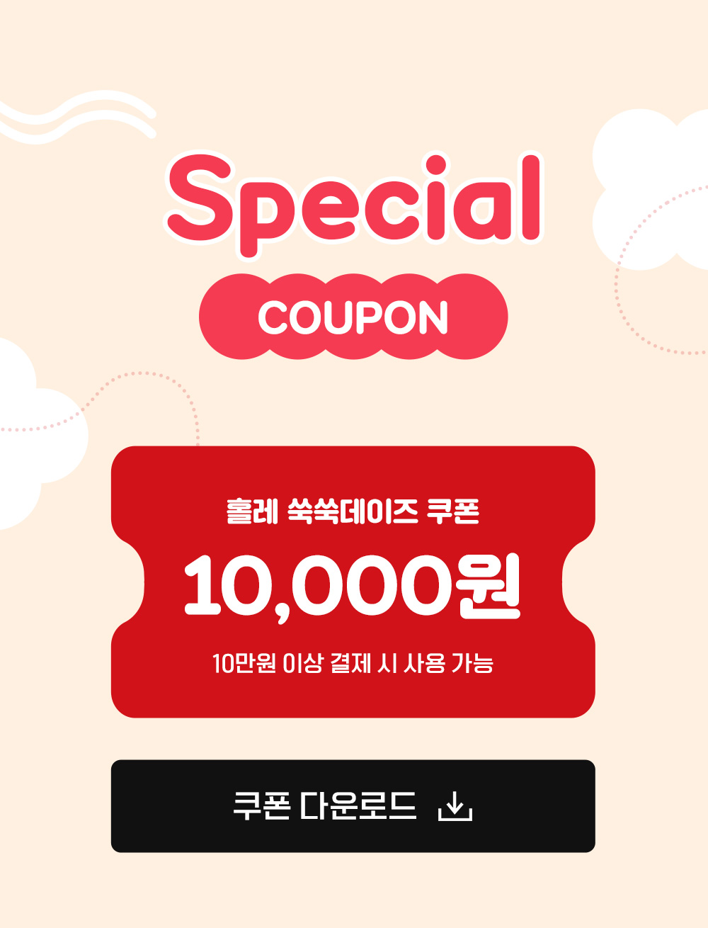 - - 쿠폰은 한 아이디당 1회 발급되며, 쑥쑥데이즈 기간 중 홀레 제품을 10만원 이상 결제할 경우 사용 가능합니다.