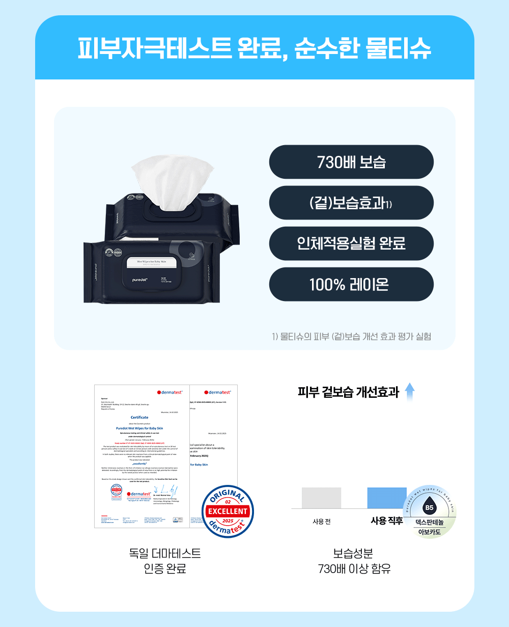 피부자극테스트 완료, 순수한 물티슈💙